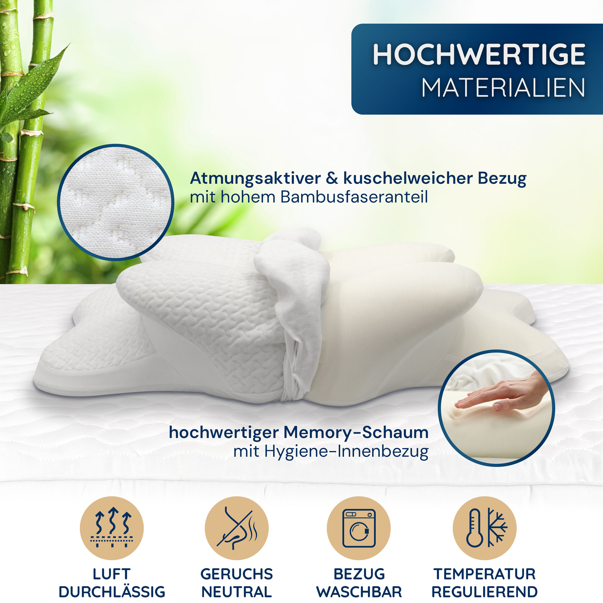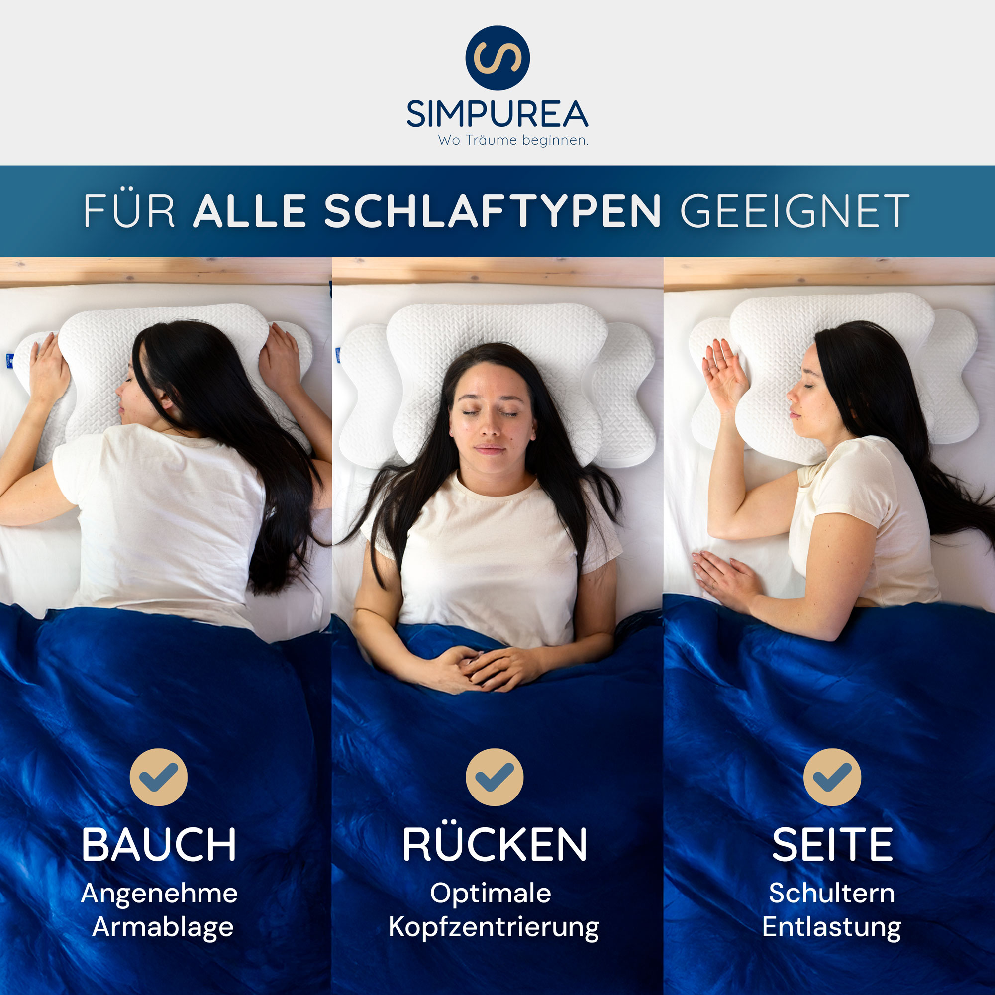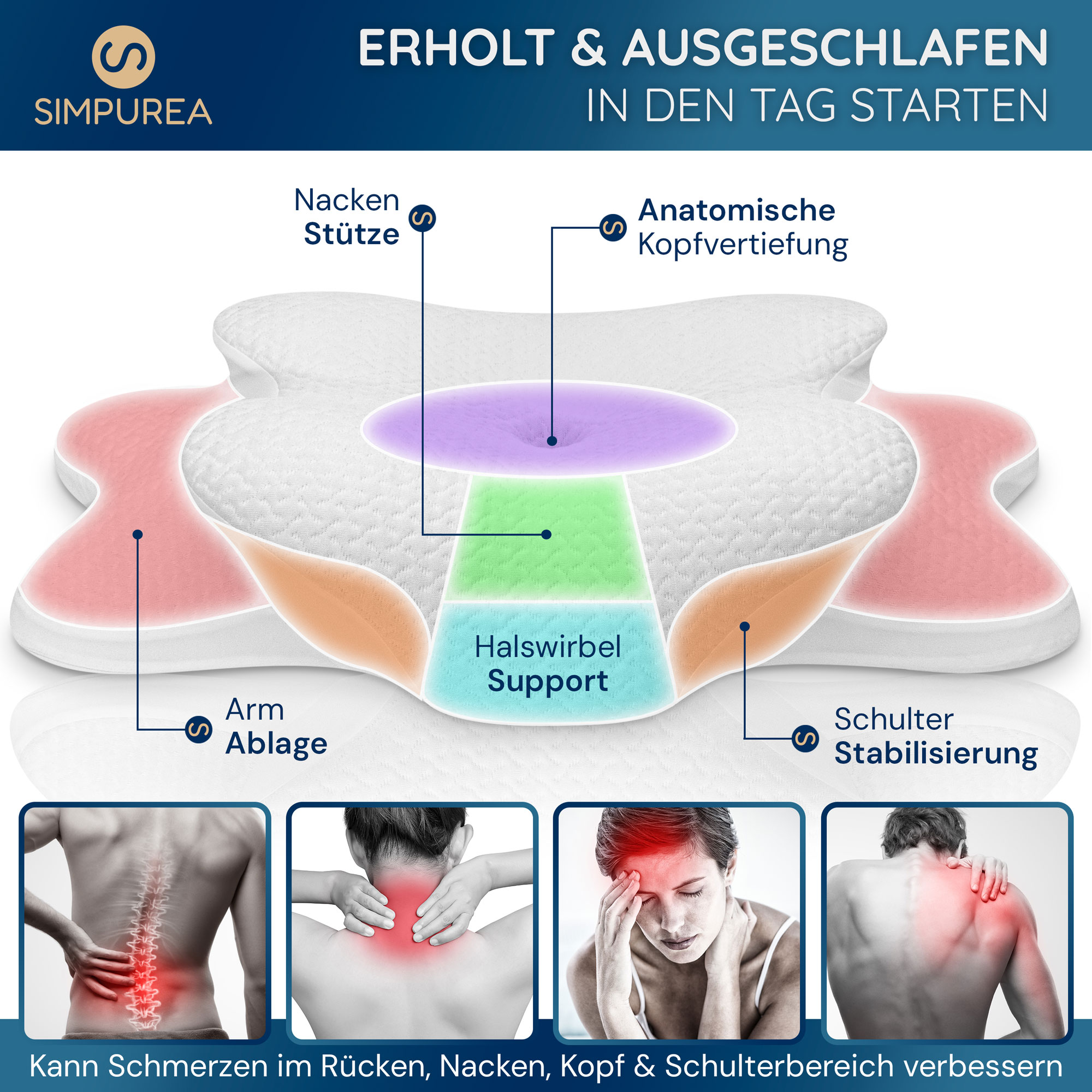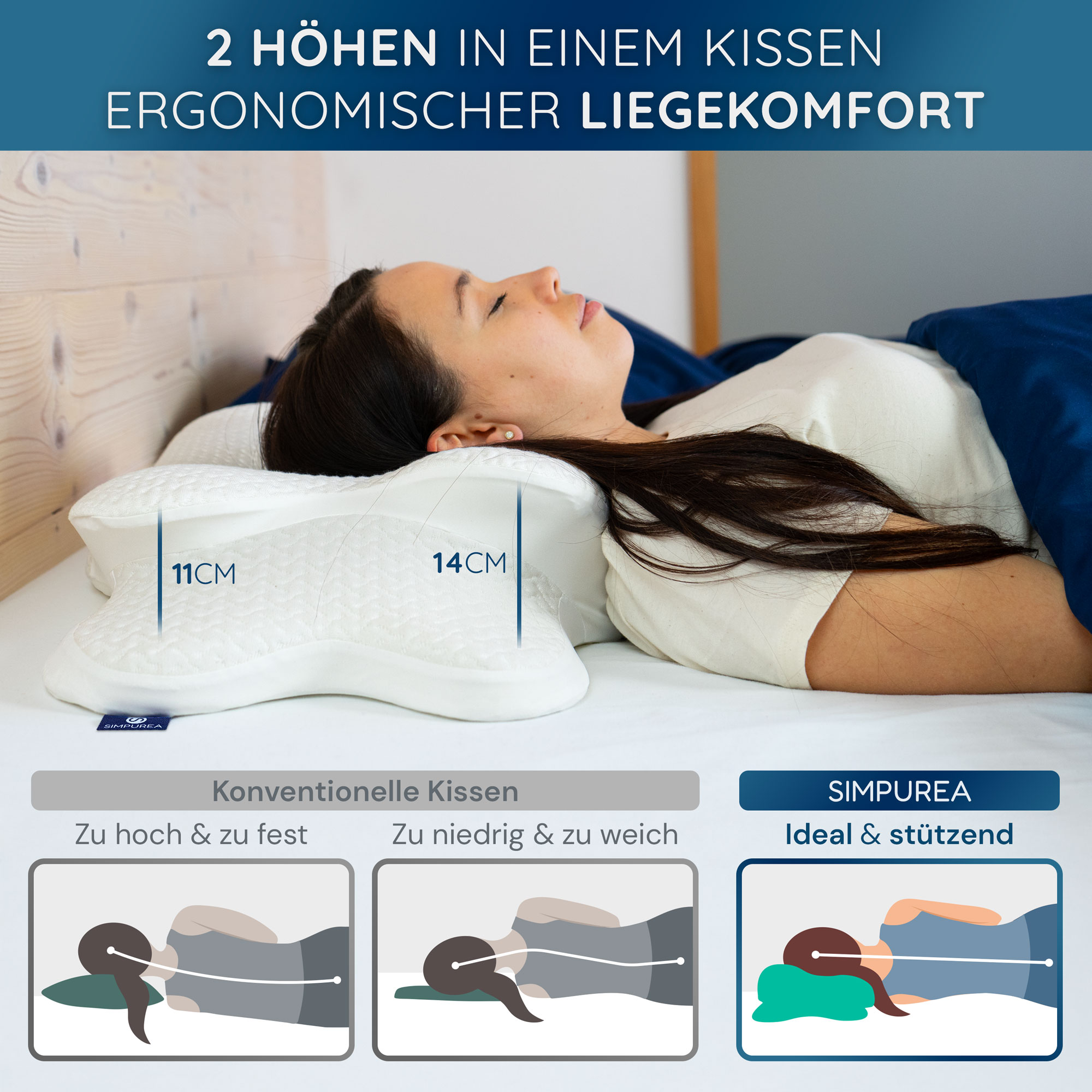 Die Bildserie kombiniert Studioaufnahmen, Detaildarstellungen und emotionale Anwendungsszenen, ergänzt durch erklärende Infografiken. Sie vermittelt auf einen Blick die ergonomischen Vorteile, Materialqualität und Vielseitigkeit des Kissens für unterschiedliche Schlaftypen.